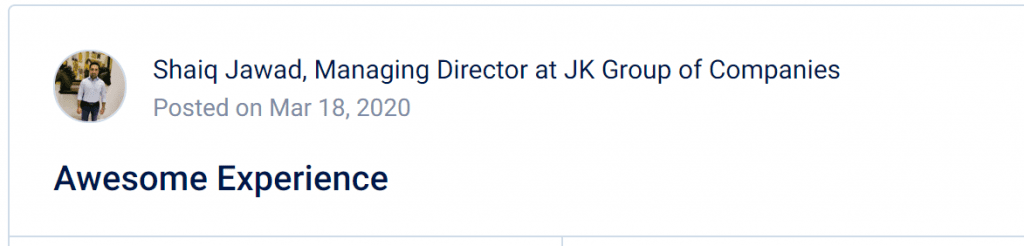 At ePromoters, our dedication to excellence extends beyond our work, as reflected in the reviews and feedback we receive from our valued clients. Shaiq Jawad, the Managing Director of J.K. Spinning Mills Ltd. , shared his thoughts on our collaboration, leaving an indelible mark on the prominent reviews and ratings platform, GoodFirms. Upon being requested for a review, Shaiq Jawad summarized his experience with ePromoters in two simple yet powerful words: “Awesome Experience.”